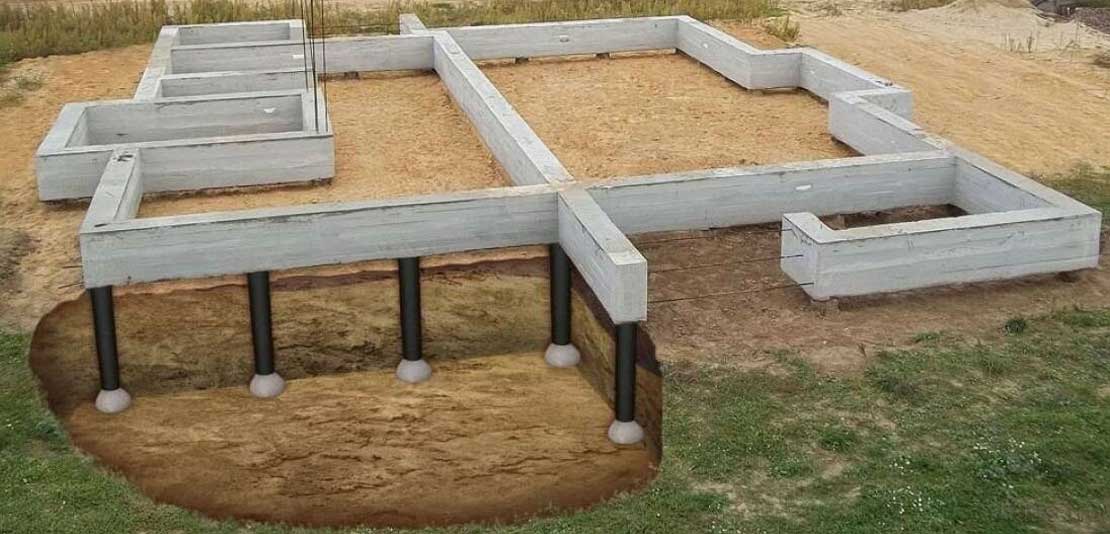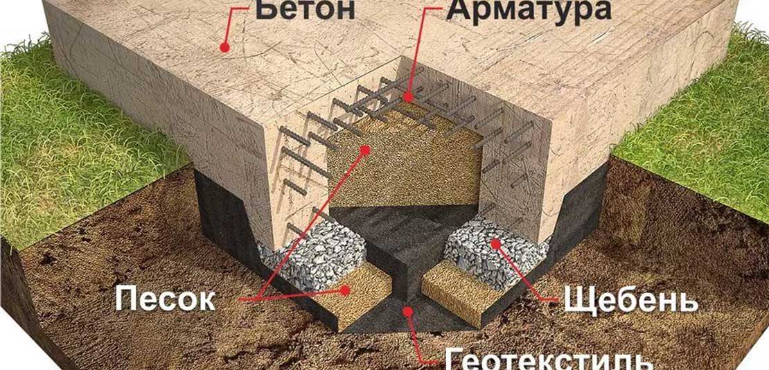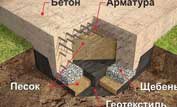 Фундамент – это строительная несущая конструкция , часть здания и сооружения, которая принимает все нагрузки от вышележащих конструкций и распределяет их по основанию. Фундамент, как правило, изготавливается из бетона или железобетона, а также камня, стали или дерева (стальных или деревянных свай). Фундаменты, как правило, закладываются ниже глубины промерзания грунта, чтобы предотвратить выпучивание. На непучинистых грунтах при строительстве лёгких деревянных построек применяют мелкозаглубленные фундаменты (фундамент, находящийся выше уровня промерзания грунта). Такой тип фундамента подходит в основном для небольших садовых домиков, летних бань и хозяйственных построек. Для строительства зданий применяются ленточные, отдельно стоящие столбчатые, свайные и плитные или комбинированные фундаменты. Они бывают сборные (сплошные монолитные или стаканного типа), монолитные и сборно-монолитные. Выбор фундамента зависит от сейсмичности местности, залегающих в основании грунтов и архитектурных решений. Изготовление фундамента из бетона возможно при температуре выше 5°С, что накладывает существенные ограничения на сезонность выполнения строительных работ. Проведение работ при более низких температурах возможно с использованием технологии электропрогрева.